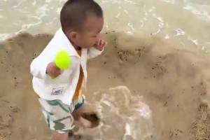 小朋友离海水超远玩沙子,没想到依旧被波及,弄了一身水