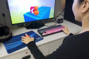 女子玩电脑游戏不太熟练,操作键盘时身体也跟着动